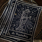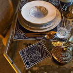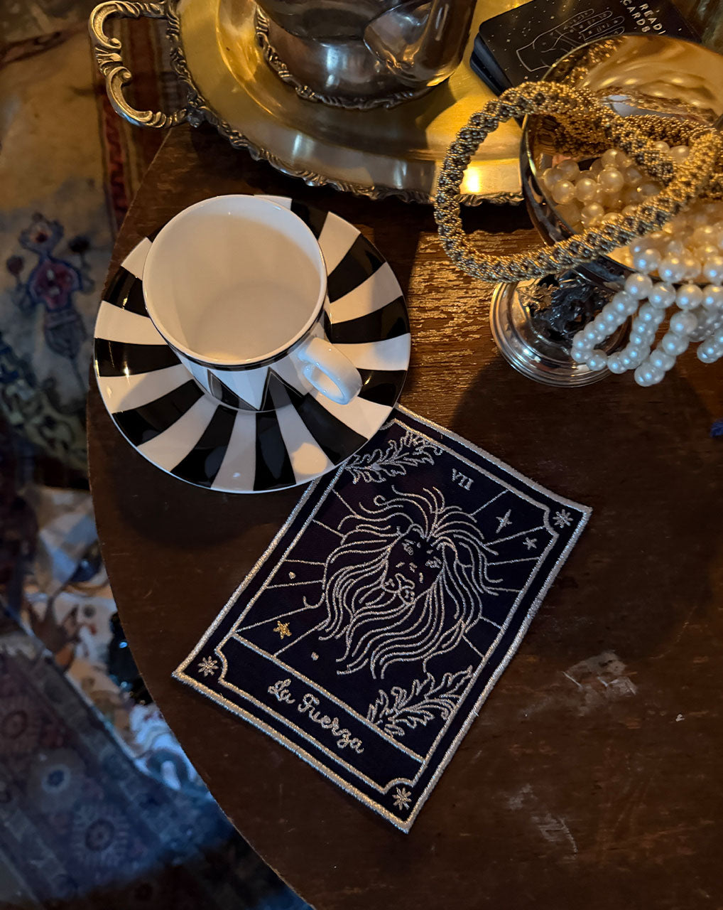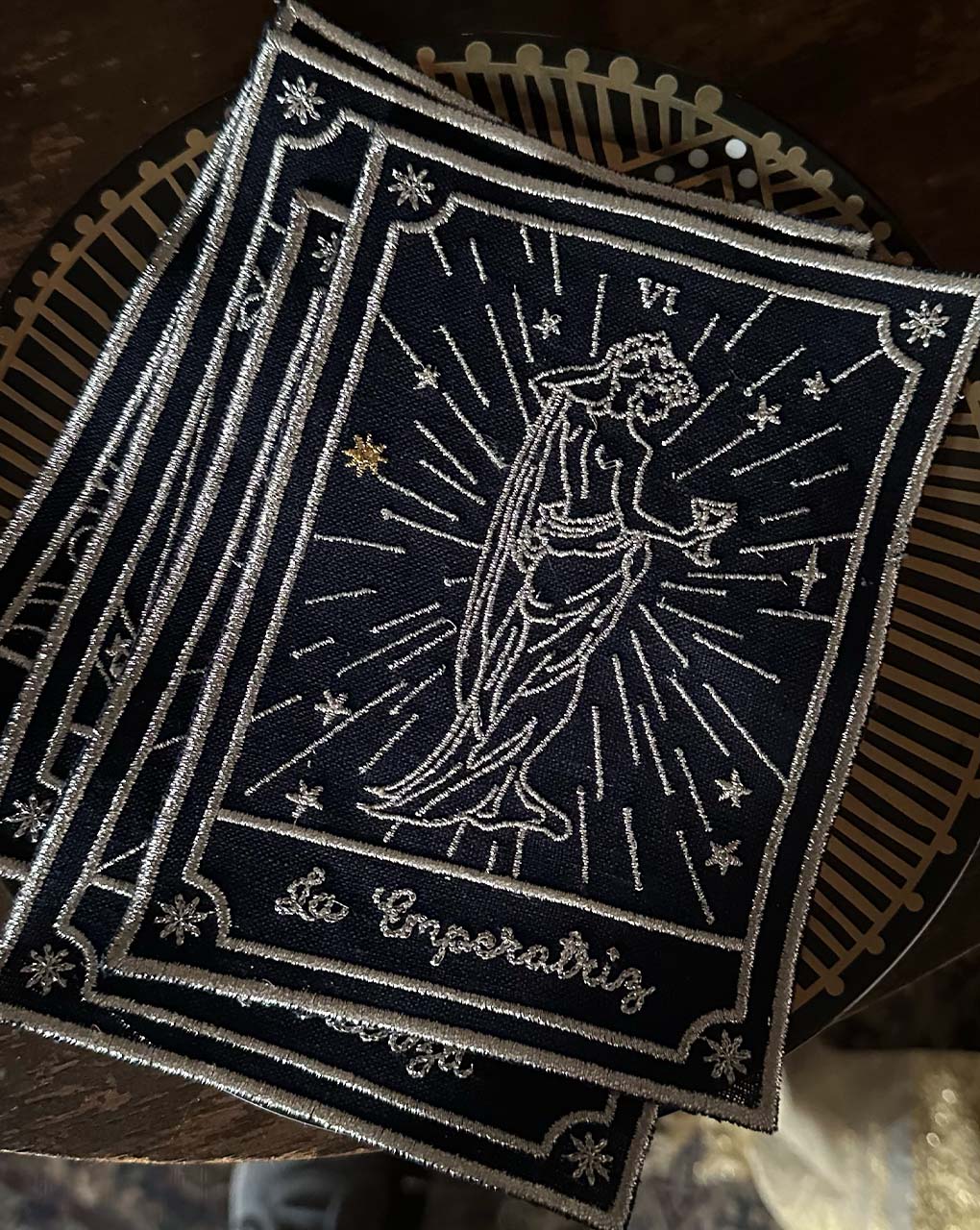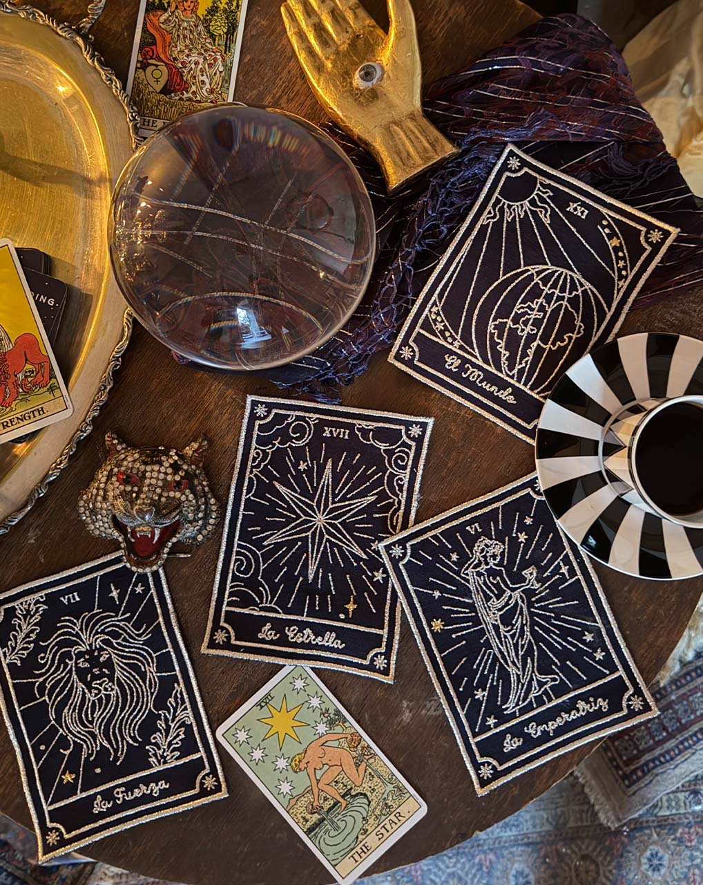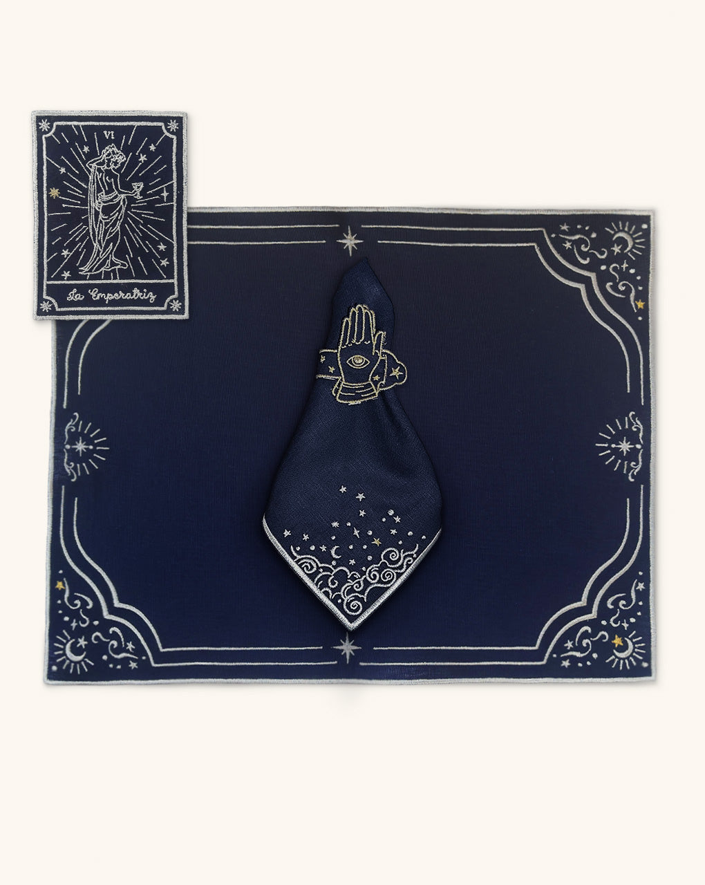 El set de mantelería más místico y mágico. Inspirado en el Tarot, y bordados en lino azul con hilo plateado y estrella dorada. Las cocteleras con bordados de cartas de arquetipos icónicos.