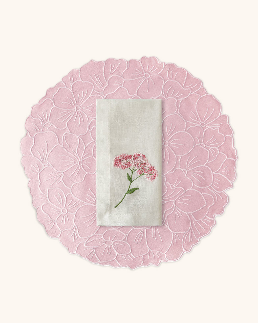 Juego con 4 individuales de hortensia rosa y 4 servilletas de lino con flor rosa bordada. Flores que duran para siempre.